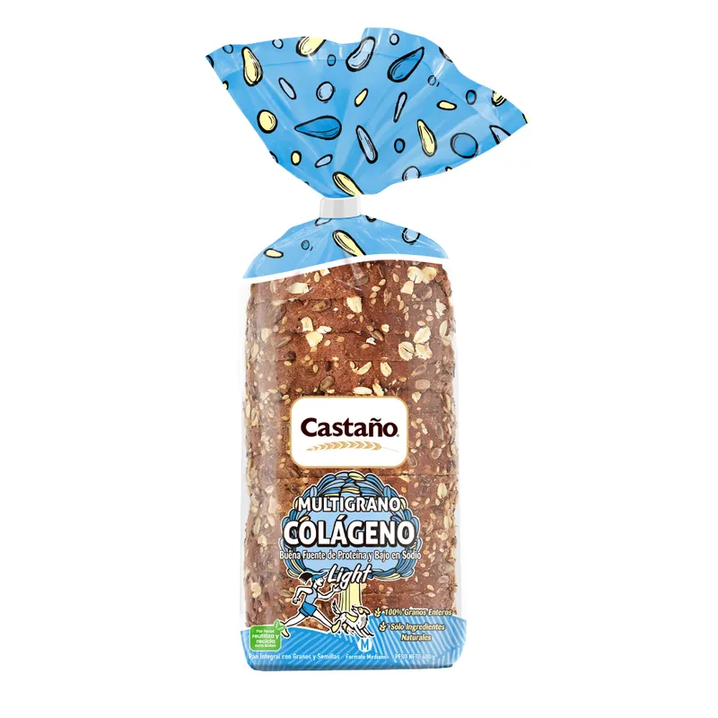 El Pan Multigrano Colágeno Light ofrece 9 g de proteína por porción, cubriendo el 19% de la DDR. Es bajo en sodio, rico en granos enteros y fibra, la mejor opción para una alimentación saludable.